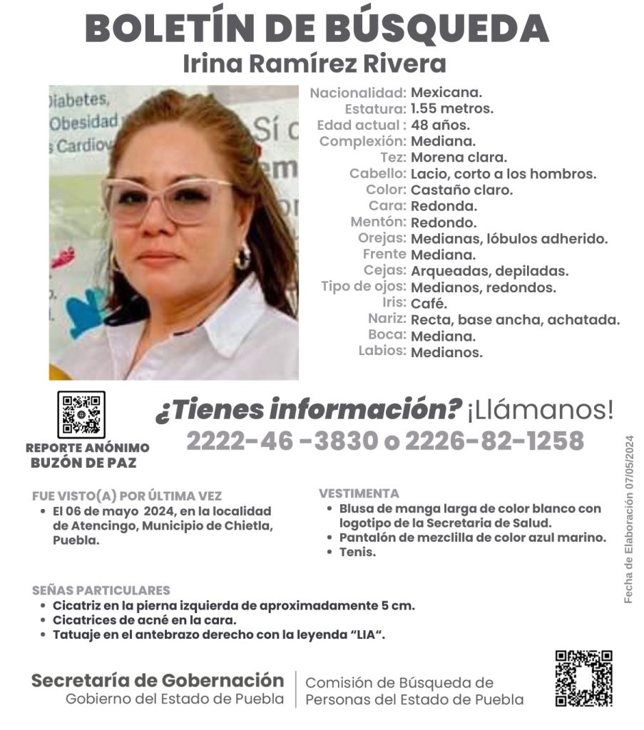 La Comisión de Búsqueda de Personas Desaparecidas en Puebla se ha unido a la investigación para localizar a una trabajadora de la Secretaría de Salud del Gobierno del Estado. Se trata de Irina Ramírez Rivera, de 48 años, quien está desaparecida desde el 6 de mayo.