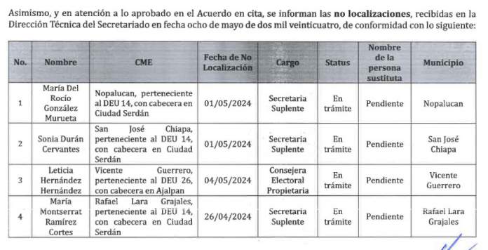 El IEE también informó el 8 de mayo que ya no pudo contactar a una consejera propietaria del municipio de Vicente Guerrero, quien dejó de estar localizable para el instituto desde el 4 de mayo.