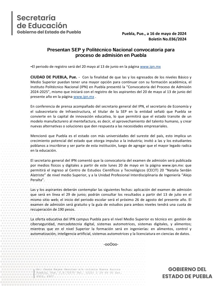 El próximo lunes 20 de mayo se abrirá la convocatoria para el proceso de admisión del Instituto Politécnico Nacional en Puebla, informaron el secretario de Educación, Jorge Estefan Chidiac y el secretario general del IPN, Mauricio Igor Jasso Zaranda.