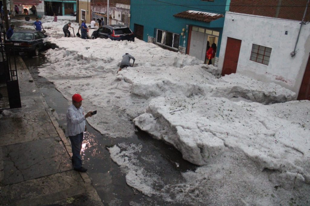 La madrugada de este domingo, personal de la Unidad de Concertación en Juntas Auxiliares y Atención Vecinal se trasladó a la calle Francisco Sarabia para continuar con las maniobras de retiro de granizo con maquinaria pesada.