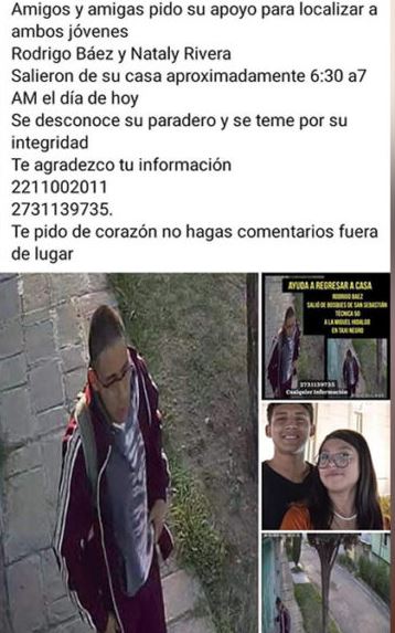 Sus familiares informaron que Rodrigo Báez y Nataly Rivera, salieron esta mañana, cerca de las 6:30 horas, con dirección a la colonia Miguel.