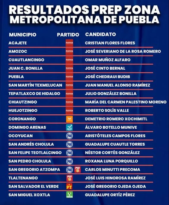 De los 19 municipios que conforman la zona metropolitana del estado de Puebla, Morena y sus aliados están a la espera del triunfo en 11 presidencias municipales, mientras que el PAN tiene una virtual victoria en cinco ayuntamientos, de acuerdo con el conteo del Programa de Resultados Electorales Preliminares (PREP) de 2024.