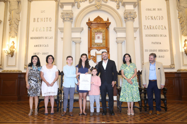 Como un reconocimiento a su papel como embajadores de la paz por el mundo y a su ejemplo de unidad, el Ayuntamiento de Puebla presidido por Adán Domínguez Sánchez reconoció como “Poblanos Distinguidos” a la familia Irigoyen Sánchez, compuesta por Bernadette Sánchez del Castillo, Alejandro Irigoyen Lazzer y sus hijos: Alexa, Diego y Vital.