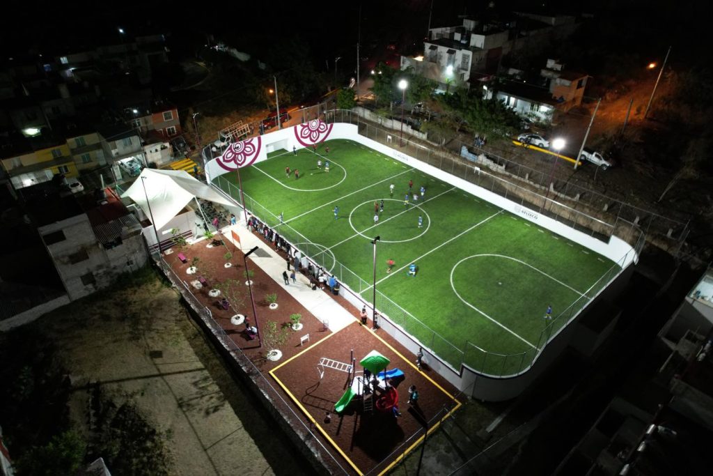 Para lograr este espacio digno, se rehabilitó la cancha con pasto sintético de 1,066.24 metros cuadrados, además de intervenir un módulo de sanitarios, una torre de multijuegos, bancas y colocación de alumbrado públicos, nuevos árboles y la construcción de un muro, en el cual, artistas locales plasmaron un mural que brinda orgullo y sentido de pertenencia a sus habitantes, informó Ariadna Ayala.