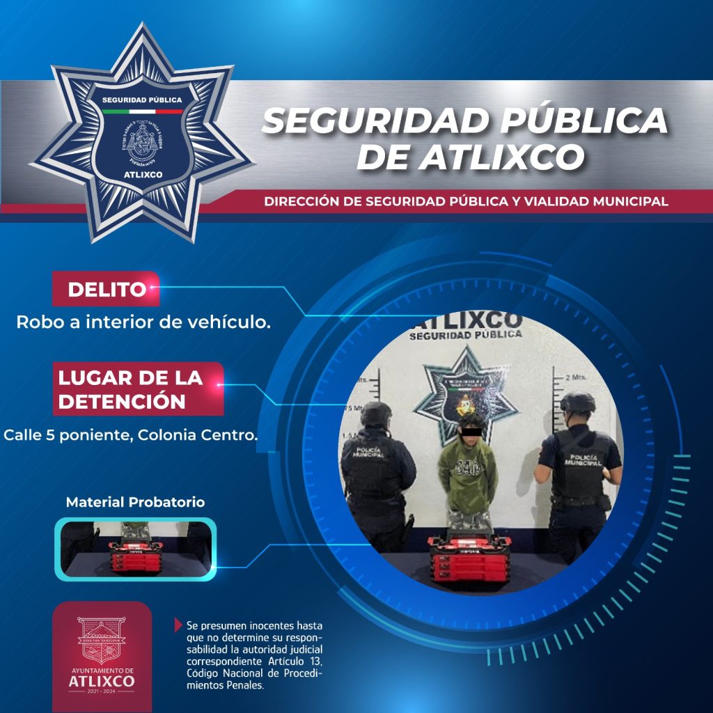 Por otra parte, durante un recorrido de seguridad y vigilancia en la colonia Centro, elementos de Seguridad Pública, brindaron apoyo a un joven a quien le habían robado una caja de herramientas que se encontraba en su carro, tras la descripción del mismo, fue interceptado en calle 5 poniente con el artículo señalado en sus manos, por lo cual fue presentado ante el MP por robo a interior de vehículo.