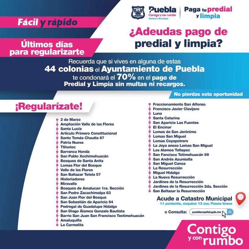 El gobierno municipal, a través de la Tesorería, continúa ofreciendo el estímulo fiscal del 70% de descuento en el pago del Impuesto de Predial y de Derechos de Limpia en 44 colonias de alta marginación y vulnerabilidad de Puebla capital para regularizar su adeudo y apoyar en la economía de las y los contribuyentes.