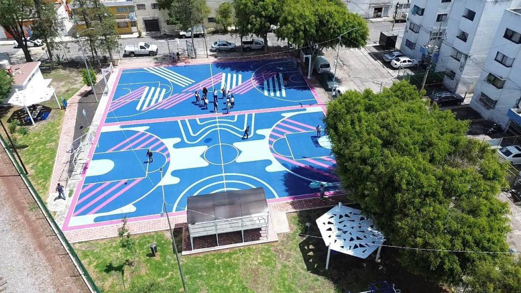 Domínguez Sánchez explicó que los trabajos que se realizaron en este espacio fueron la aplicación de 860 metros cuadrados de Top Deportivo color Azul Tenis para la cancha.