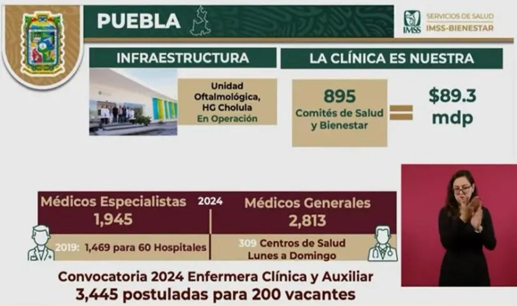 - La llegada del IMSS-Bienestar a Puebla ha significado un importante avance en la atención médica, con un aumento del 32% en especialistas y la creación de una Unidad de Oftalmología en el Hospital General de Cholula