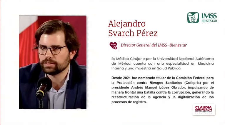 Claudia Sheinbaum, virtual presidenta electa anunció que Alejandro Svarch Pérez, actual director de la Comisión Federal para la Protección contra Riesgos Sanitarios (Cofepris), será el director general del IMSS- Bienestaren su gobierno.