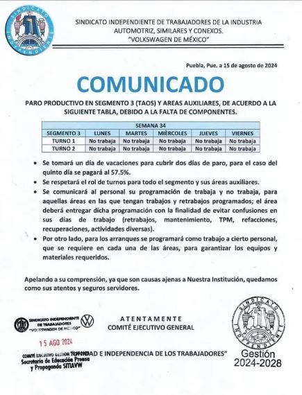Para la próxima semana habrá paro técnico en el segmento TAOS de la planta de Volkswagen por falta de materiales, así lo informó el Sindicato Independiente de Volkswagen (Sitiavw).