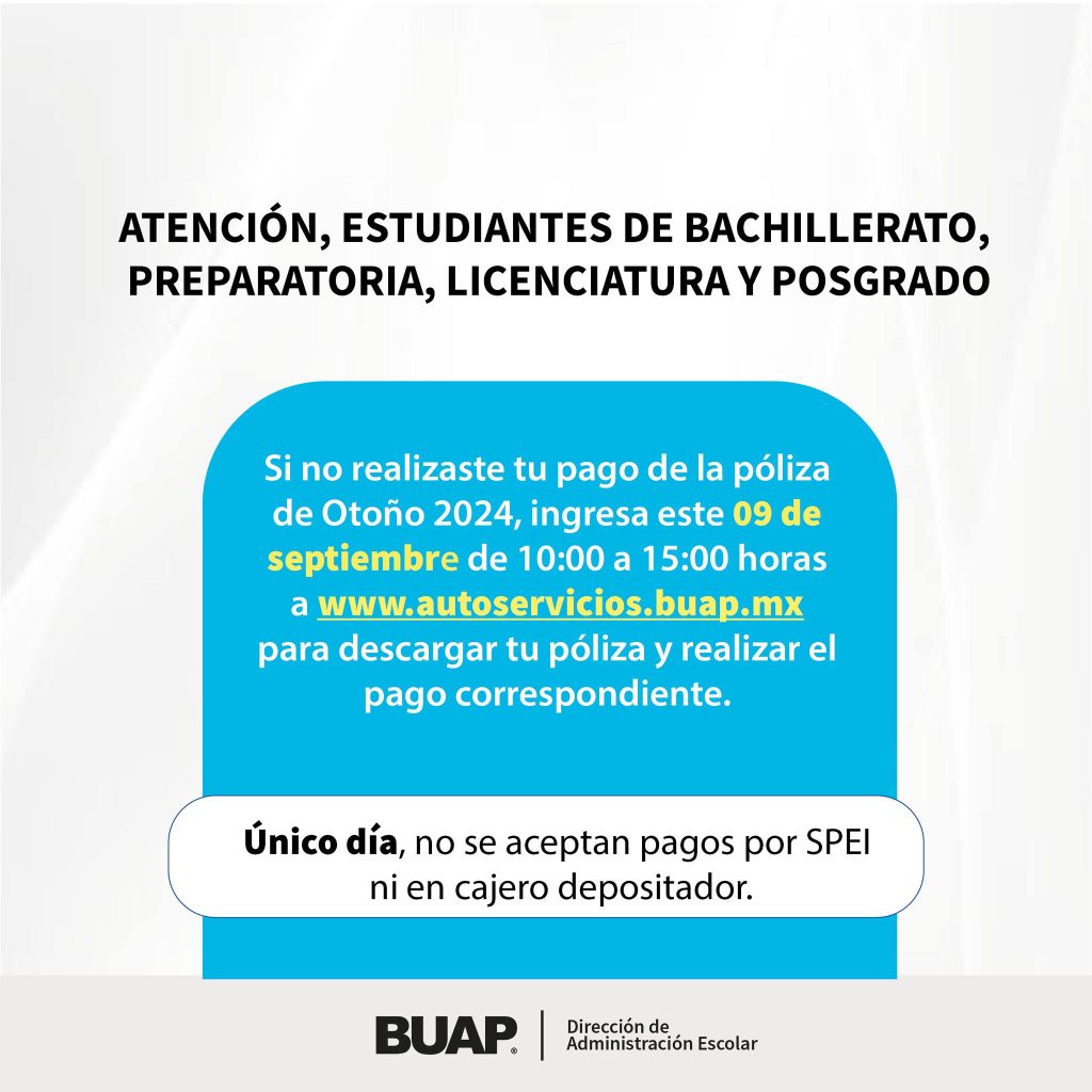 Los estudiantes que aún no han pagado su póliza deberán ingresar al sitio web www.autoservicios.buap.mx para descargar su póliza y realizar el pago correspondiente.