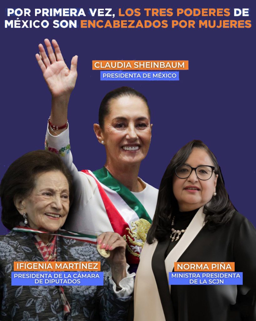 Por lo anterior, por primera vez en la historia política de la República Mexicana… hoy tres mujeres presiden los Poderes Ejecutivo, Judicial y Legislativo.