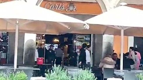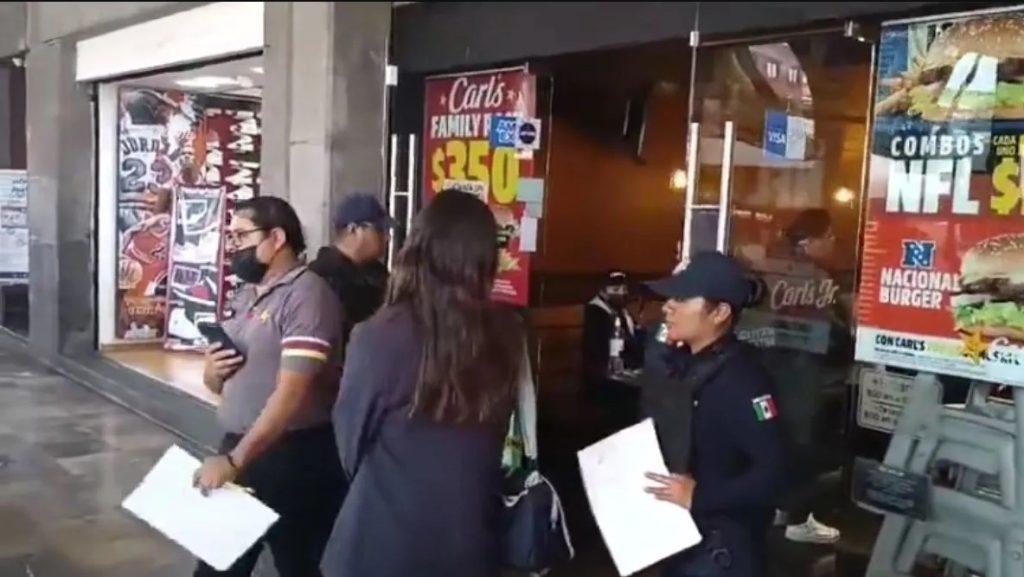 Por un supuesto adeudo en renta del local valorada en 3 millones de pesos, fuerza pública y personal de juzgado desalojaron Carl’s Junior del Centro Histórico para embargar el local; policías estatales resguardan la zona.