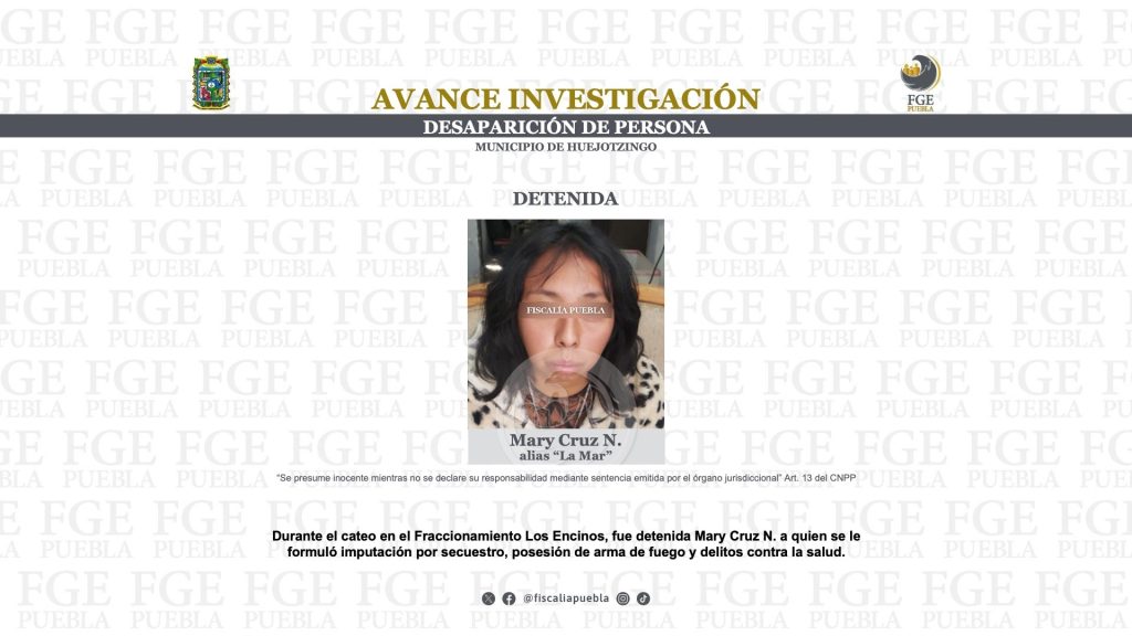 En ese cateo, dos personas más lograron escapar por las azoteas, pero dejaron abandonado a un menor de edad de 7 años, y se logró la detención de una mujer identificada como Mary Cruz N., alias “La Mar”, a quien se le imputan los delitos de secuestro y posesión de arma de uso exclusivo del Ejército, y ya se encuentra en prisión preventiva, en espera de su audiencia.