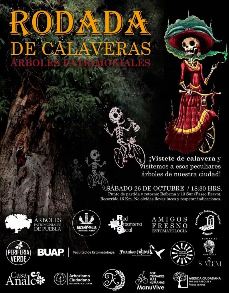 La asociación Árboles Patrimoniales de Puebla convoca a la Rodada de Calaveras, un evento que combina tradición, ciclismo y activismo ambiental en el marco de las celebraciones de la Temporada de Día de Muertos en la capital poblana.