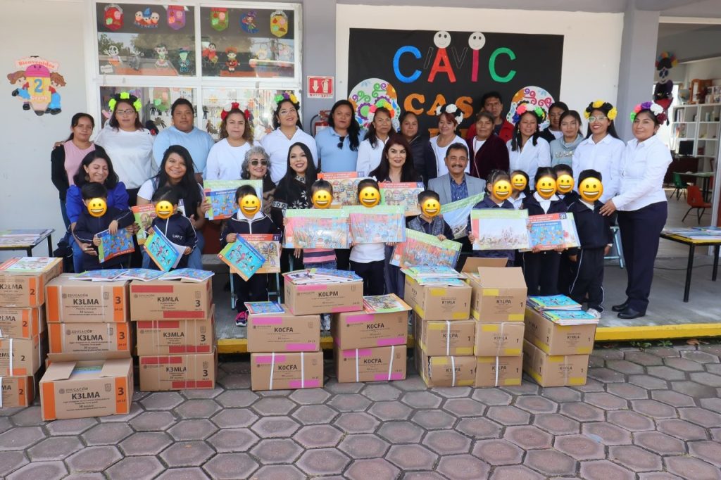 31 de octubre, 2024. San Pedro Cholula, Pue.- Con el objetivo de apoyar la educación, el Sistema Municipal DIF (SMDIF), en conjunto con el Gobierno Municipal de San Pedro Cholula, presidido por Tonantzin Fernández, entregó de manera simbólica libros de texto gratuitos a menores del Centro de Atención Infantil Comunitario (CAIC) Casa de Cultura.