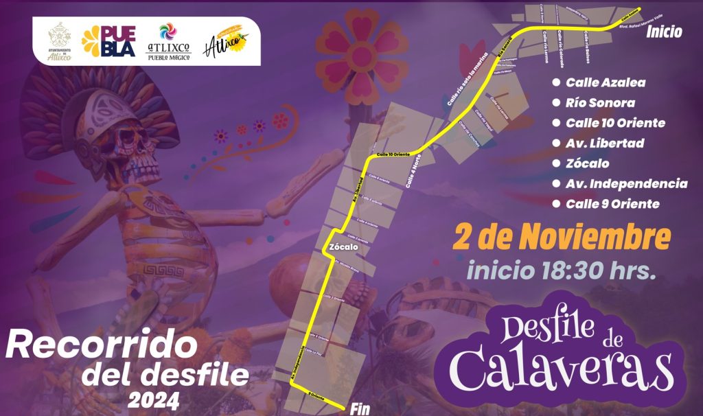 La ruta avanzará por Río Sonora, 10 oriente, avenida Libertad, hasta llegar al zócalo de Atlixco y seguir por avenida Independencia y 9 oriente, donde los asistentes podrán disfrutar de las alegorías, disfraces y representaciones artísticas que rinden homenaje a la tradición del Día de Muertos.