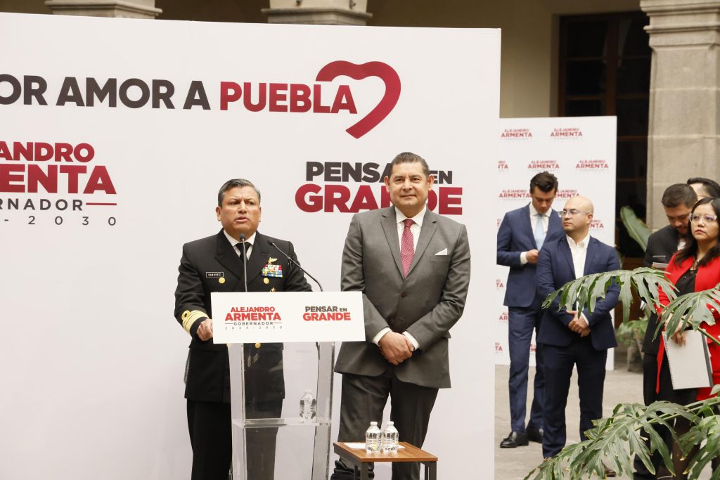 Puebla, Pue.– El gobernador electo, Alejandro Armenta, designó al Vicealmirante Francisco Sánchez González como Secretario de Seguridad Ciudadana. Sánchez González cuenta con el respaldo de la presidenta de la República, Claudia Sheinbaum y de Omar García Harfuch, Secretario de Seguridad y Protección Ciudadana Federal. “Para nosotros es muy importante que hubiera alguien de primer nivel pero que también conociera Puebla, quiero decirles que el Vicealmirante Francisco Sánchez González, fue quien nos ayudó para los mandos que ya están trabajando en los municipios y que es una estrategia integral, mandos municipales y mando estatal”.
