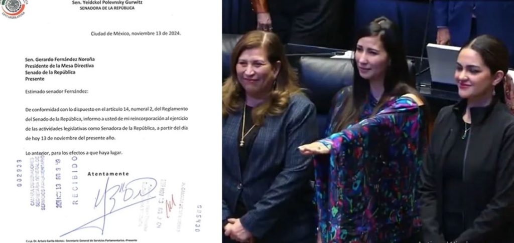 Yeidckol Polevnsky Gurwitz, senadora por el Partido del Trabajo (PT), reanudó su función legislativa este 13 de noviembre, menos de un día después de ceder temporalmente su escaño a su suplente, Denisse Ortiz Pérez. La reactivación de su cargo fue confirmada mediante un documento entregado a Gerardo Fernández Noroña, presidente de la Mesa Directiva del Senado de la República.