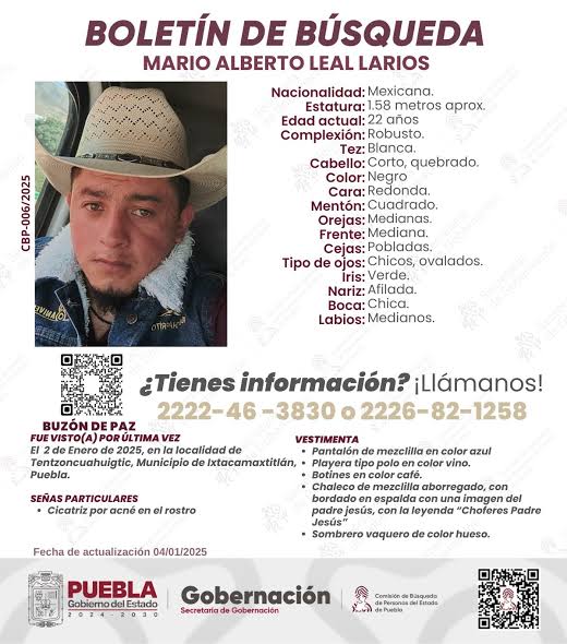 Mario Alberto Leal Larios, un joven activista de 22 años originario de Tentzoncuahuigtic, perteneciente al municipio de Ixtacamaxtitlán, fue reportado como desaparecido desde el pasado 2 de enero de 2025, cuando salió de su hogar para asistir a un baile de feria.