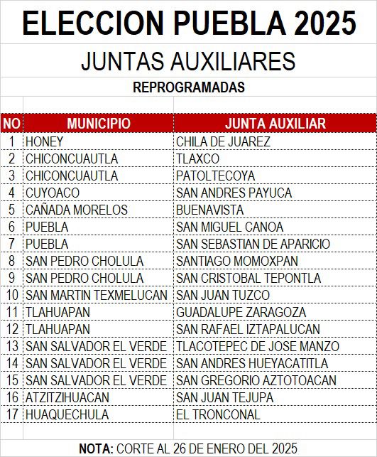 En segundo quedaron San Pedro Cholula, Chiconcuautla y Tlahuapan, con dos elecciones suspendidas de autoridades auxiliares canceladas. La lista con las localidades donde se anuló la votación es la siguiente.