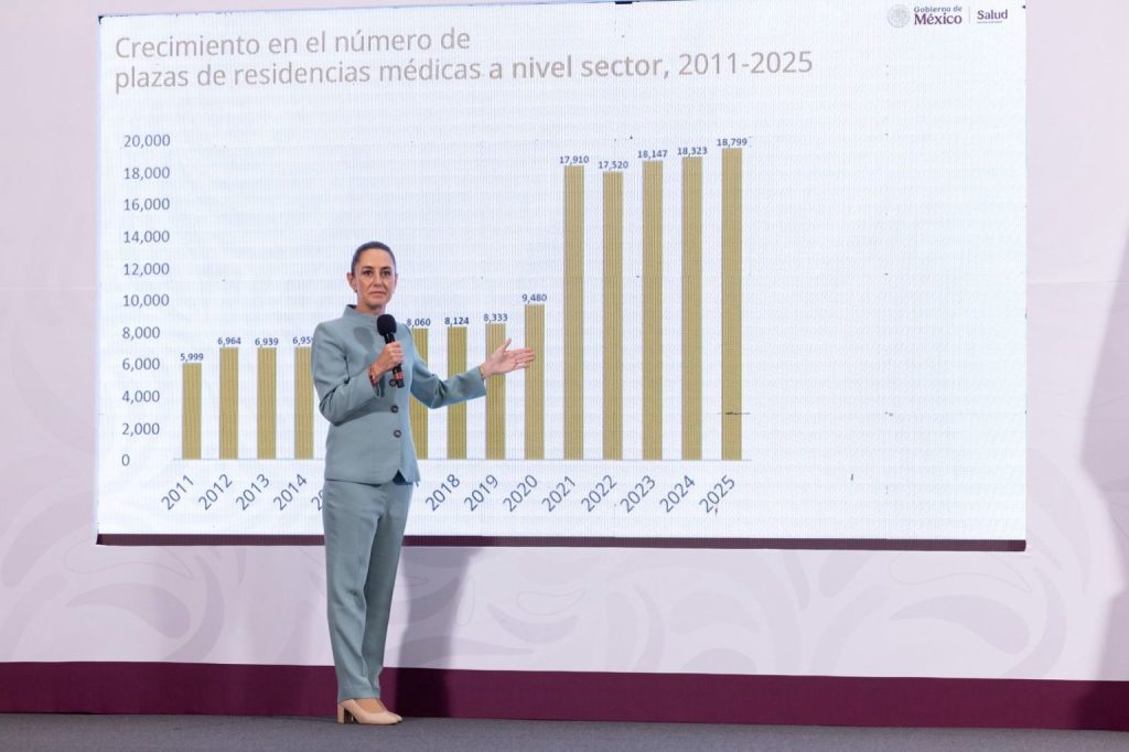 La Jefa del Ejecutivo Federal, destacó que en comparación con el periodo neoliberal donde solo ingresaban 6 mil personas a las residencias médicas en todo el país, con la Cuarta Transformación se triplicó esta cifra ya que a la fecha se forman 18 mil 799 especialistas.