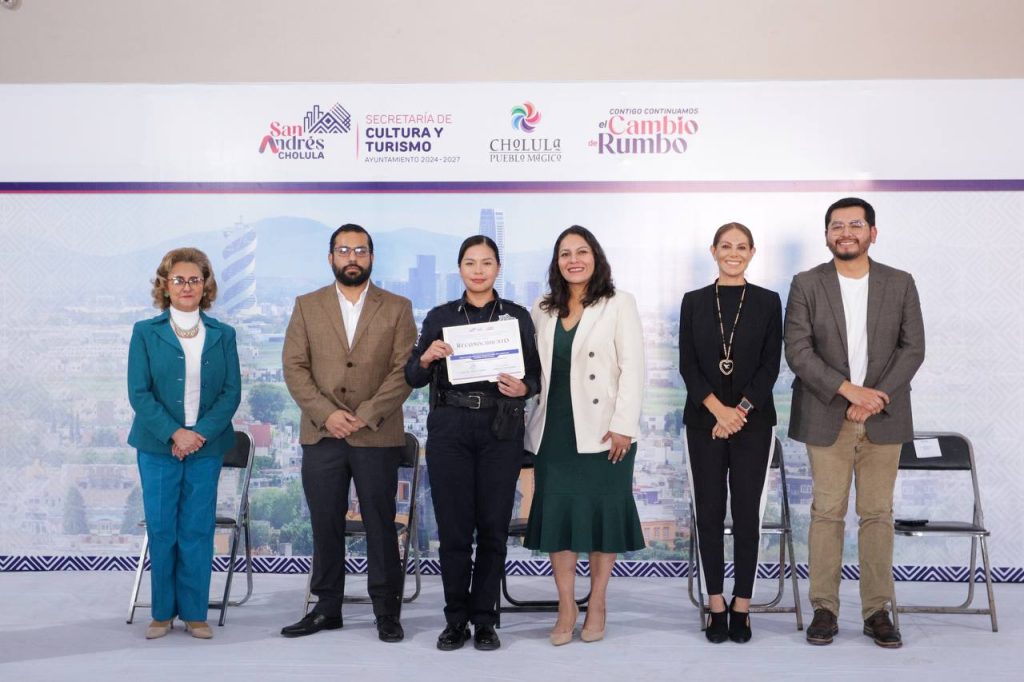 San Andrés Cholula, Puebla. – Con el objetivo de fortalecer el desarrollo turístico y mejorar la atención a visitantes, la presidenta municipal de San Andrés Cholula, Lupita Cuautle Torres, encabezó la entrega de reconocimientos a los participantes del programa «Embajadores Turísticos».