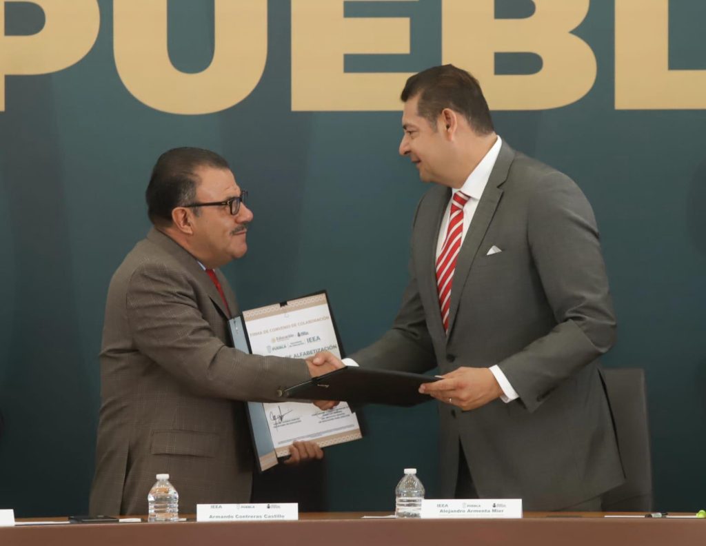 Ciudad de Puebla, Pue.- En un esfuerzo sin precedentes para erradicar el analfabetismo en Puebla, el director general del INEA, Armando Contreras Castillo y el gobernador Alejandro Armenta, firmaron un convenio que busca reducir a la mitad el rezago educativo en el estado y convertirlo en un referente nacional en materia de alfabetización.