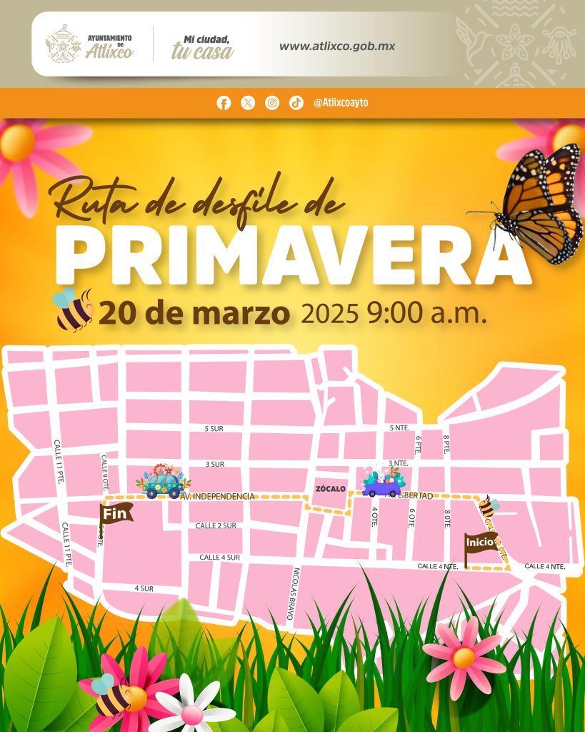 Este jueves 20 de marzo, a partir de las 09:00 de la mañana, Atlixco se llenará de color, música y alegría para dar la bienvenida a la primavera con su tradicional desfile.