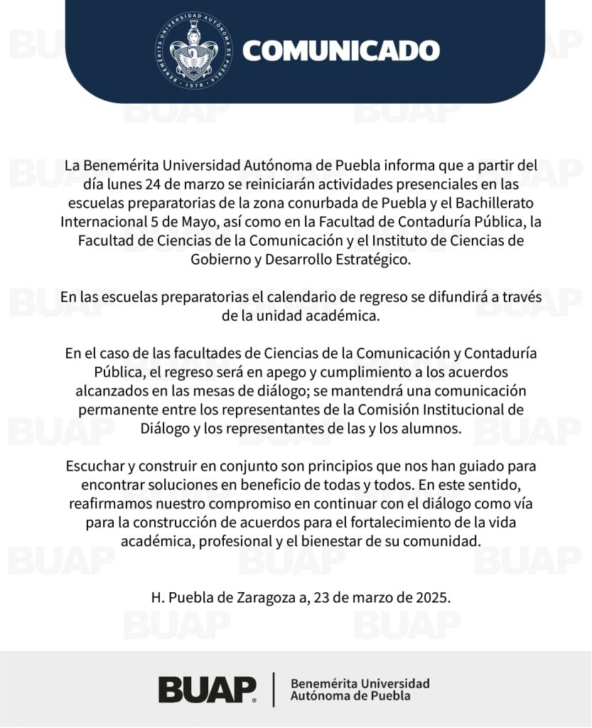 Este lunes 24 de marzo las preparatorias de la zona conurbada de Puebla y algunas facultades de la BUAP regresarán a clases presenciales, tras llegar a acuerdos con la Comisión Institucional de Diálogo.