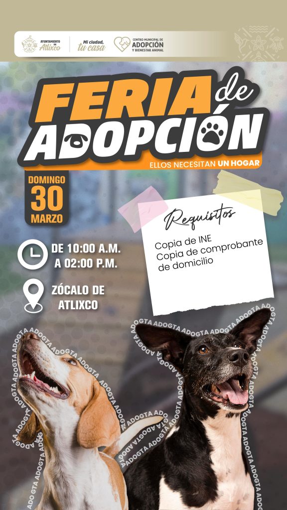 Este domingo 30 de marzo, el corazón de Atlixco se llenará de ladridos de alegría y colas movedoras. El Zócalo de la ciudad será el escenario de la Feria de Adopción, donde lomitos rescatados esperan encontrar a su familia
