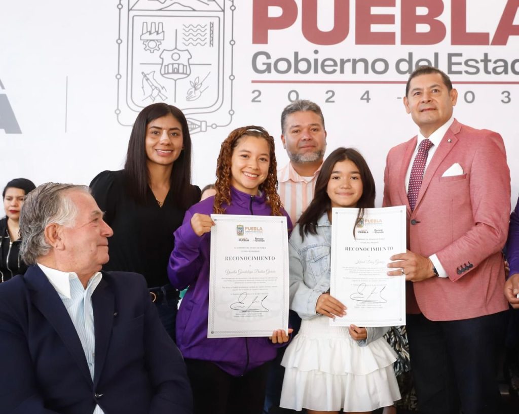 CIUDAD DE PUEBLA, Pue.- Como parte del impulso permanente al deporte en la entidad, el gobernador del estado de Puebla, Alejandro Armenta, entregó reconocimientos a las deportistas poblanas Karol Díaz Gómez y Yoselin Guadalupe Bailón García, quienes destacaron durante el Macrorregional C de Levantamiento de Pesas, realizado el pasado fin de semana en Tabasco.