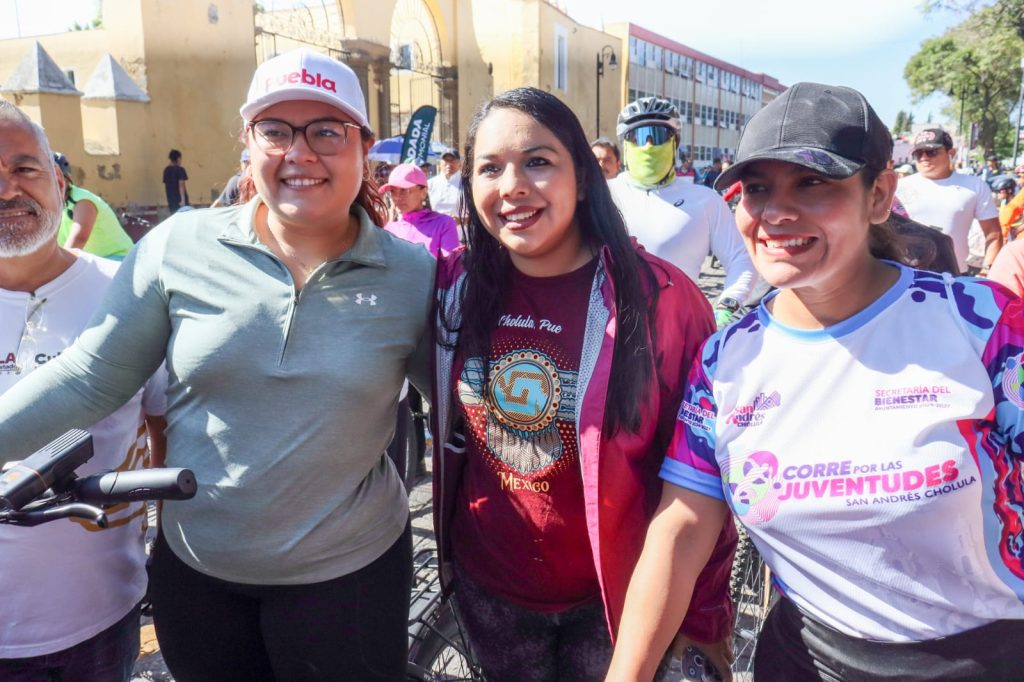 San Pedro Cholula, Pue.- La titular de la Secretaría de Cultura estatal, Alejandra Pacheco Mex, visitó este domingo los municipios de San Pedro y San Andrés Cholula para participar en una rodada ciclista, acompañada por las presidentas municipales Tonantzin Fernández y Lupita Cuautle.