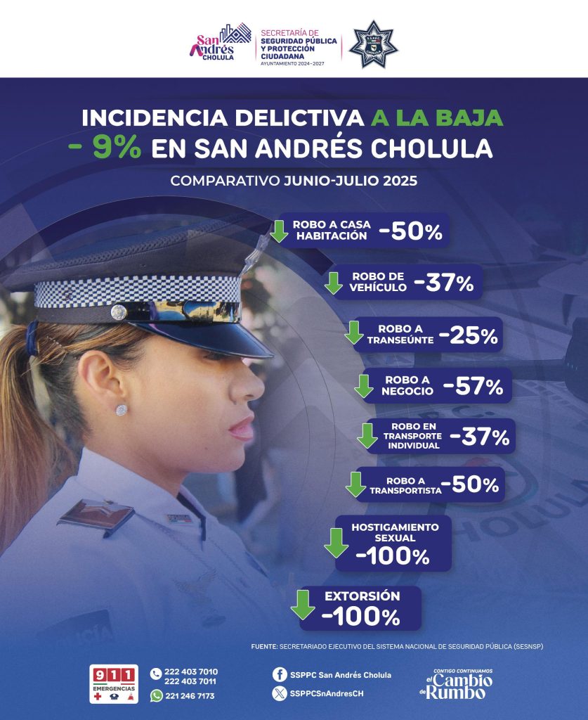 San Andrés Cholula, Pue.- El Ayuntamiento de San Andrés Cholula, encabezado por la presidenta municipal Lupita Cuautle Torres, informó que durante julio de 2025 la incidencia delictiva disminuyó un 9% en comparación con el mes anterior, de acuerdo con cifras del Secretariado Ejecutivo del Sistema Nacional de Seguridad Pública (SESNSP).