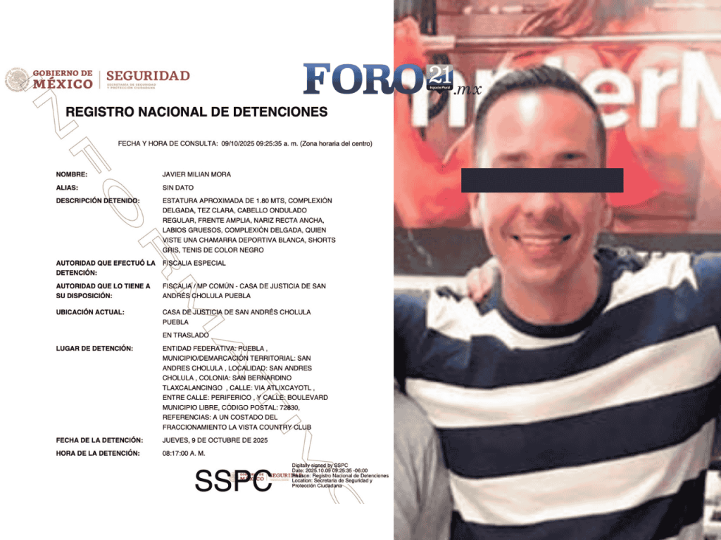 De acuerdo con el Registro Nacional de Detenciones, consultado a las 10:20 horas de este jueves, Javier N. se encuentra actualmente en la Casa de Justicia de San Andrés Cholula, donde en las próximas horas se determinará su situación jurídica. Hasta el momento, la Fiscalía General del Estado (FGE) no ha emitido un pronunciamiento oficial sobre el caso.