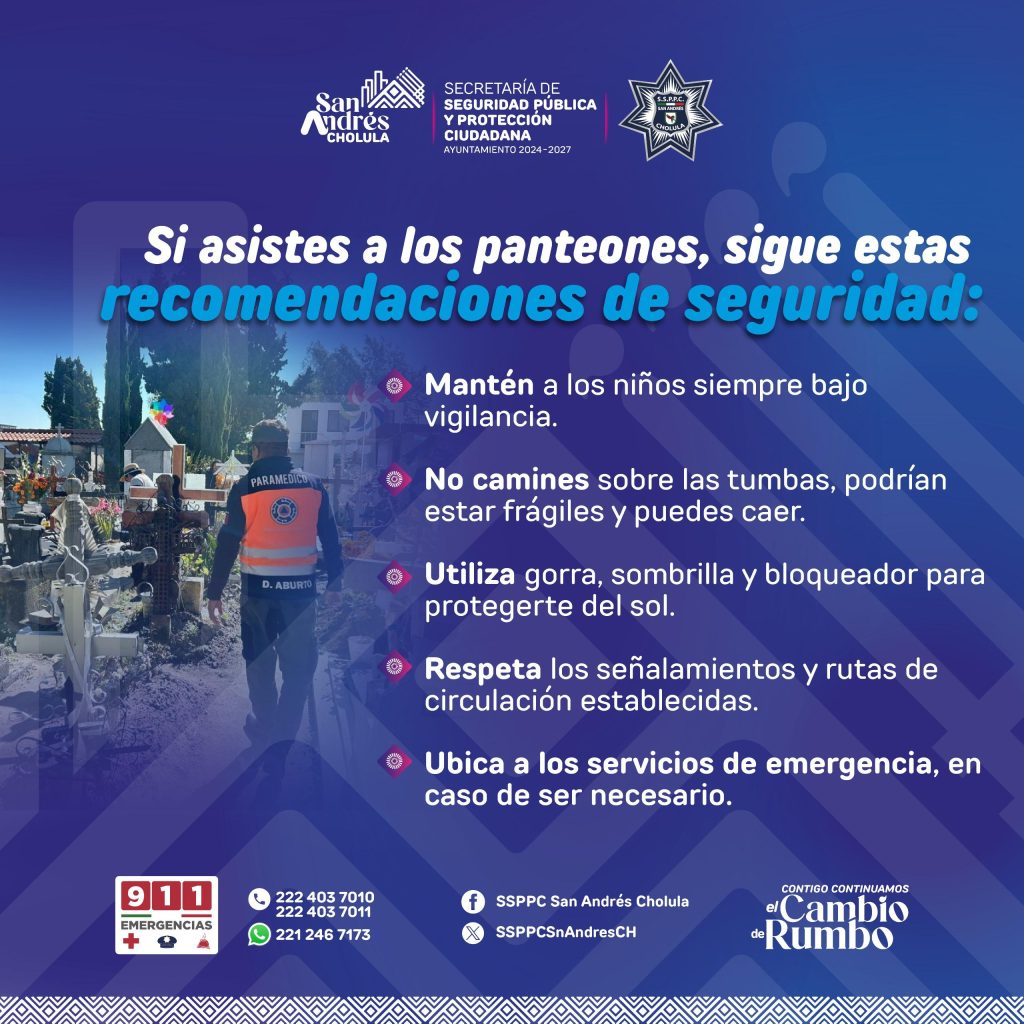 La Dirección de Protección Civil realizará recorridos en los camposantos para la detección y exhorto de posibles zonas de riesgo. Adicionalmente, el Centro de Emergencias (DCE) mantendrá el monitoreo de videovigilancia y pondrá a disposición los números de emergencia 2224037010 o 2224037011, y el WhatsApp 2212467173.