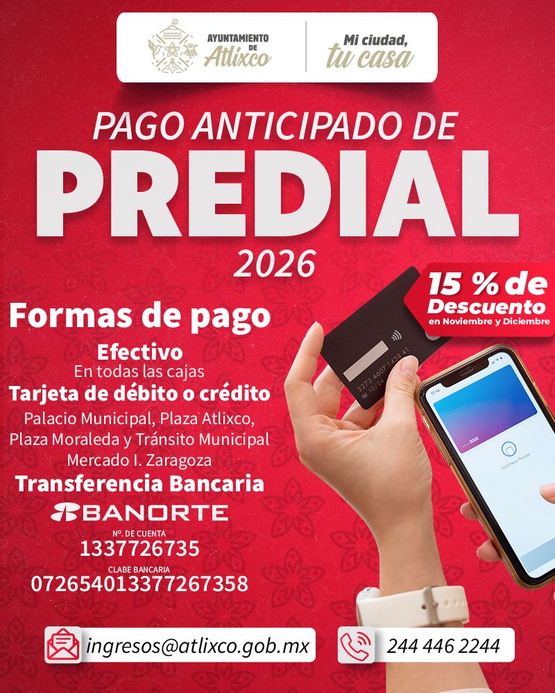 La presidenta Ariadna Ayala recordó que los pagos pueden realizarse de lunes a viernes, de 8:00 a 15:45 horas, en múltiples cajas recaudadoras, incluyendo el Palacio Municipal, Rastro, Tránsito, Alberca Municipal, Plaza Moraleda, Plaza Atlixco, CRI y Mercado Ignacio Zaragoza. Se aceptan tarjetas de crédito o débito y transferencias bancarias.