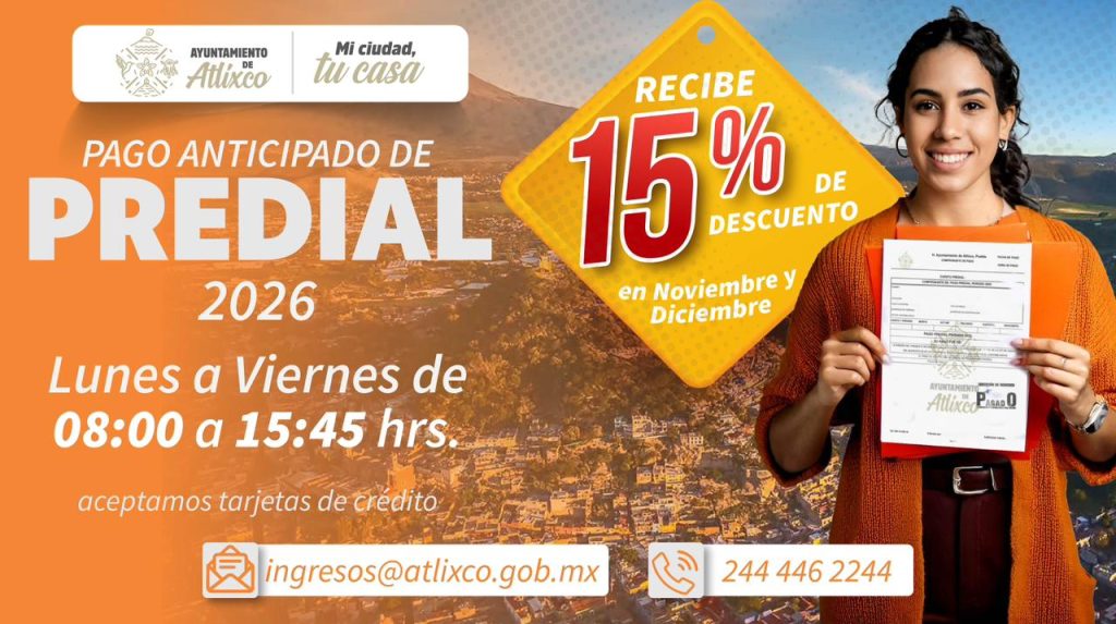 Durante los meses de noviembre y diciembre, las y los contribuyentes podrán obtener un 15% de descuento al realizar el pago anticipado del Predial 2026.