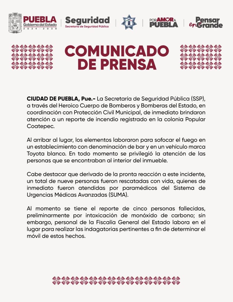 - La SSP confirmó 5 fallecimientos y 9 personas rescatadas. La FGE investiga el suceso, ocurrido en la 11 Sur y 105 Poniente, bajo la línea de ataque directo y presunto cobro de piso.