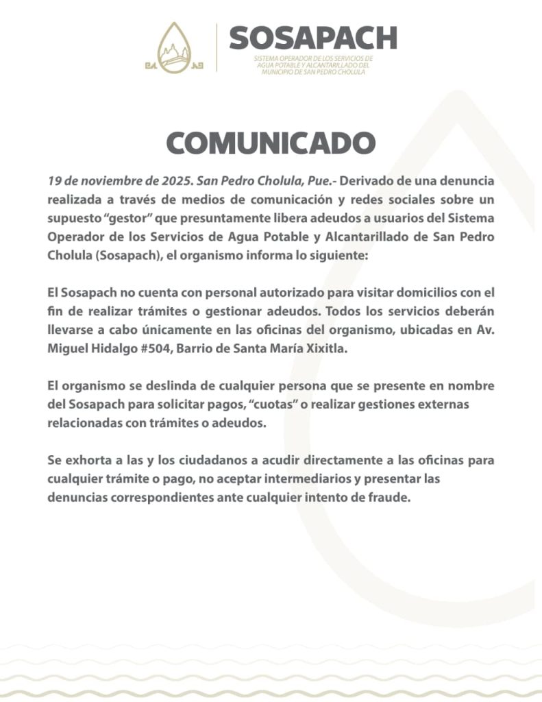 SAN PEDRO CHOLULA, Pue. – El Sistema Operador de los Servicios de Agua Potable y Alcantarillado de San Pedro Cholula (SOSAPACH) emitió una alerta a la ciudadanía tras detectarse la presencia de un supuesto «gestor» que, a través de redes sociales y medios de comunicación, ofrece presuntamente liberar adeudos a usuarios del servicio.