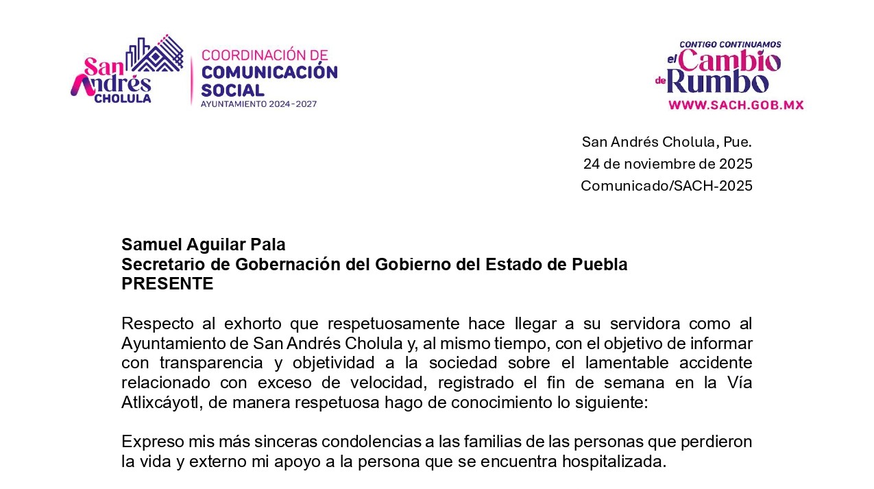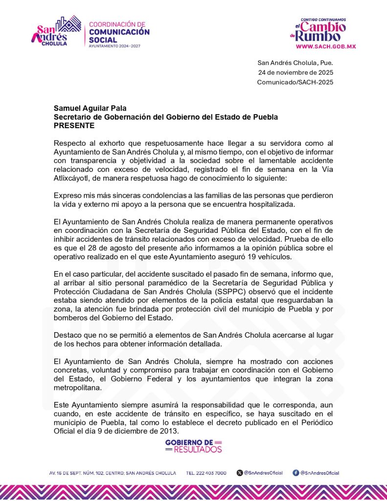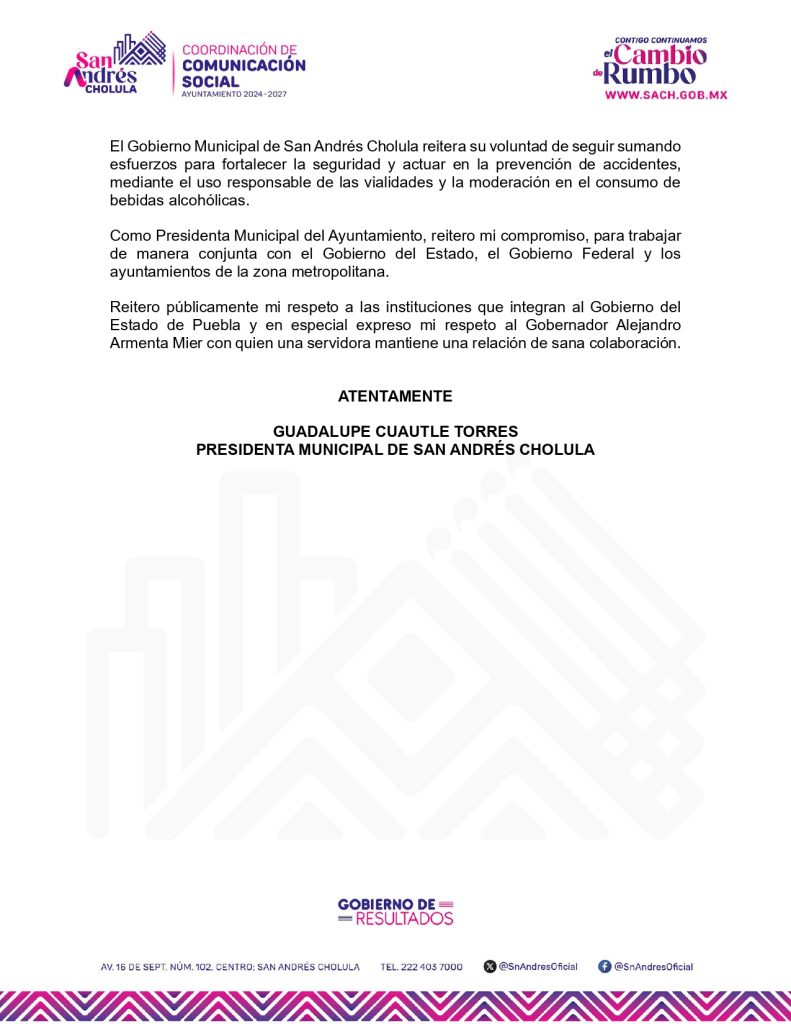 SAN ANDRÉS CHOLULA, Pue. – La presidenta municipal de San Andrés Cholula, Guadalupe Cuautle Torres , emitió un comunicado oficial dirigido al Secretario de Gobernación del Gobierno del Estado de Puebla, Samuel Aguilar Pala , en respuesta al exhorto recibido tras el lamentable accidente ocurrido el pasado fin de semana en la Vía Atlixcáyotl.