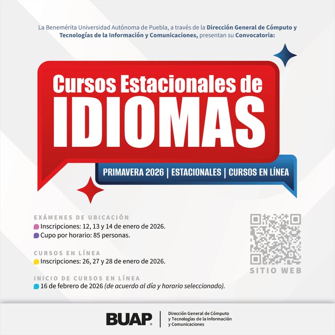 CIUDAD DE PUEBLA, Pue. – Para arrancar el año académico y personal con nuevas habilidades, la Benemérita Universidad Autónoma de Puebla (BUAP), a través de la Dirección General de Cómputo y Tecnologías de la Información y Comunicaciones (DCyTIC), ha lanzado la convocatoria para sus Cursos Estacionales de Idiomas en el periodo Primavera 2026 .