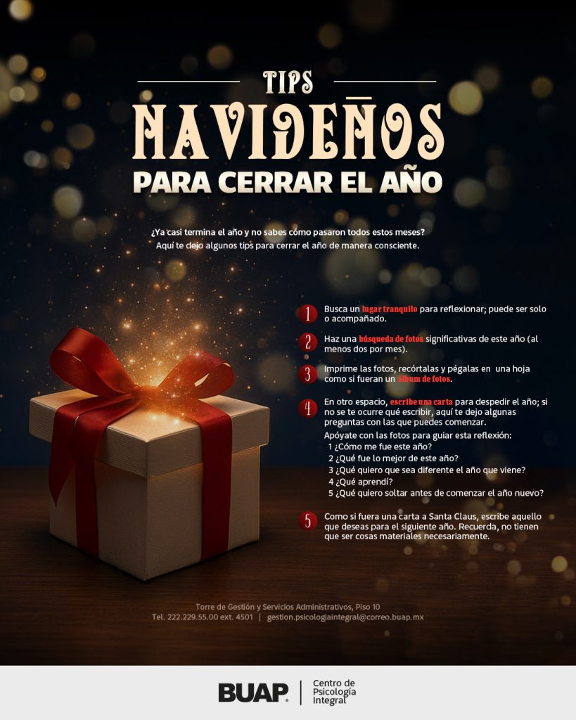 CIUDAD DE PUEBLA, Pue. – A punto de concluir el año 2025 y con el objetivo de promover el bienestar emocional de la comunidad, la Dirección de Psicología de la Benemérita Universidad Autónoma de Puebla (BUAP) compartió una serie de cinco tips para realizar un «Cierre Consciente» del año e iniciar el 2026 con mayor claridad y propósito .