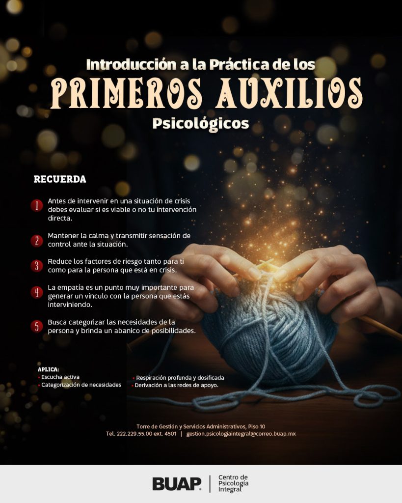Adicionalmente, la BUAP comparte pautas para la Introducción a la Práctica de los Primeros Auxilios Psicológicos, herramientas esenciales para apoyar a alguien cercano que se encuentre en una situación de crisis.