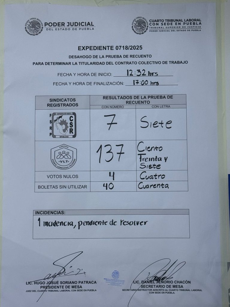 Con un resultado de 137 contra 7, el sindicato Vicente Lombardo Toledano encabezado por el maestro René Sánchez Juárez obtuvo el triunfo en esta contienda electoral sindical para poder ser el administrador del contrato colectivo de trabajo de dicha empresa de la mano de sus representados en GML COMPONENTS.
