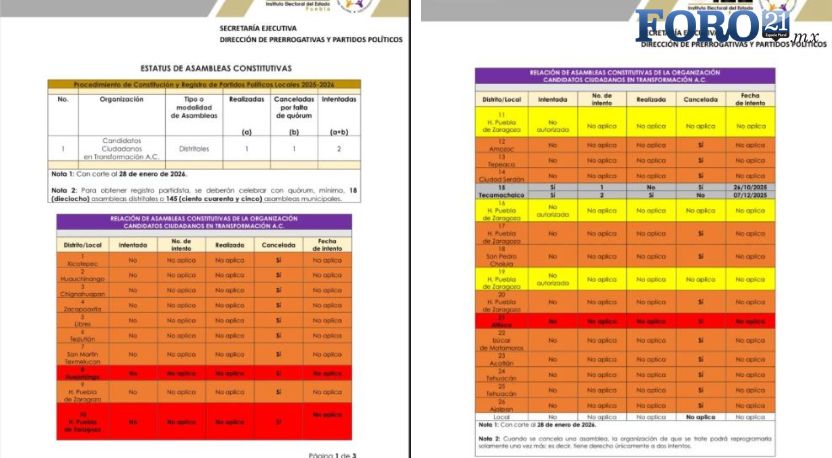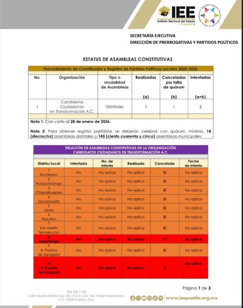 CIUDAD DE PUEBLA, Pue. — El sueño de convertir a la organización civil «Ciudadanos en Transformación» en el cuarto partido político estatal de Puebla se ha desvanecido. Al vencer el plazo legal el pasado 31 de enero, la agrupación conocida como Fuerza Obradorista no logró cumplir con el número mínimo de asambleas distritales exigidas por el Instituto Electoral del Estado (IEE).