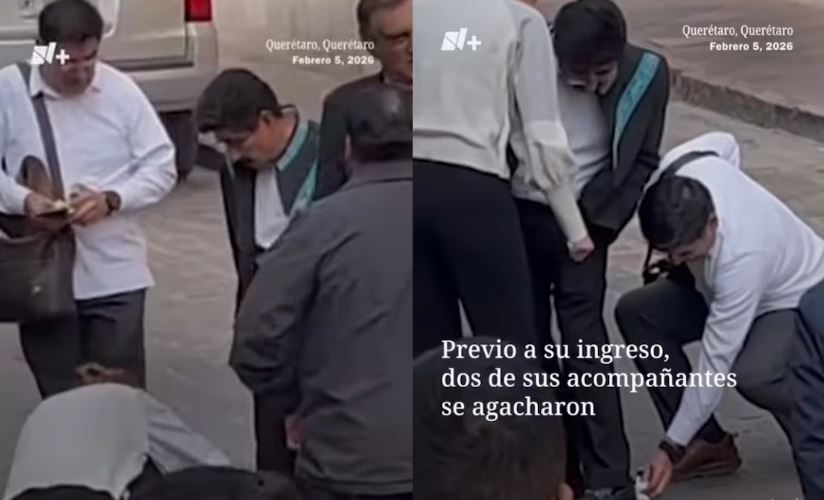 Previo a su entrada al Teatro de la República en Querétaro, para la conmemoración del aniversario de la promulgación de la Constitución Política de los Estados Unidos Mexicanos, cámaras de N+ captaron que el ministro presidente de la Suprema Corte de Justicia de la Nación (SCJN) se encontraba con dos personas a su alrededor, cuando una de ellas se agacha para limpiarle el calzado.