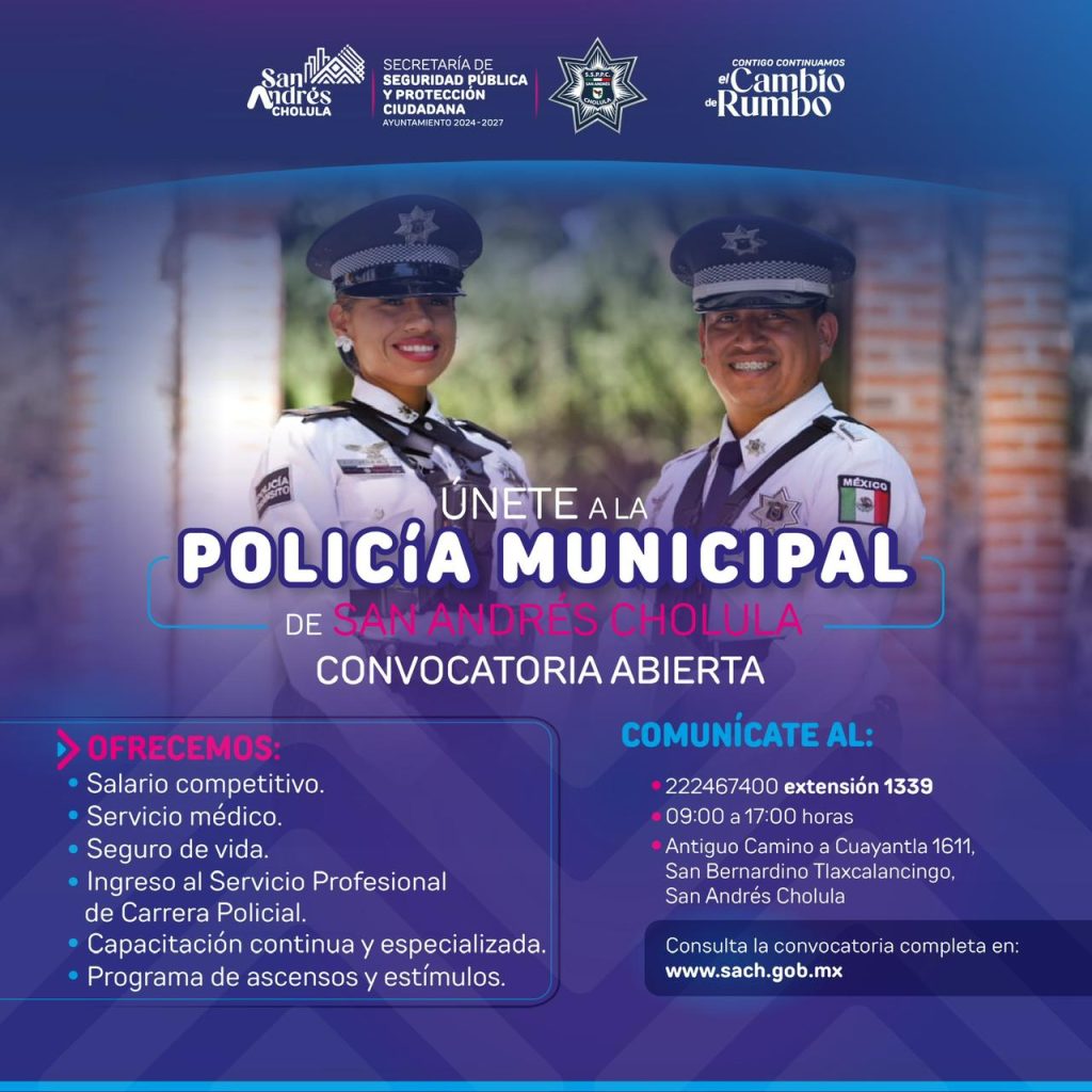 SAN ANDRÉS CHOLULA, Pue. — Con el objetivo de robustecer la vigilancia y garantizar la paz social en el municipio, la Secretaría de Seguridad Pública y Protección Ciudadana (SSPPC) de San Andrés Cholula lanzó una convocatoria formal para mujeres y hombres que deseen integrarse a las filas de la Policía Municipal.