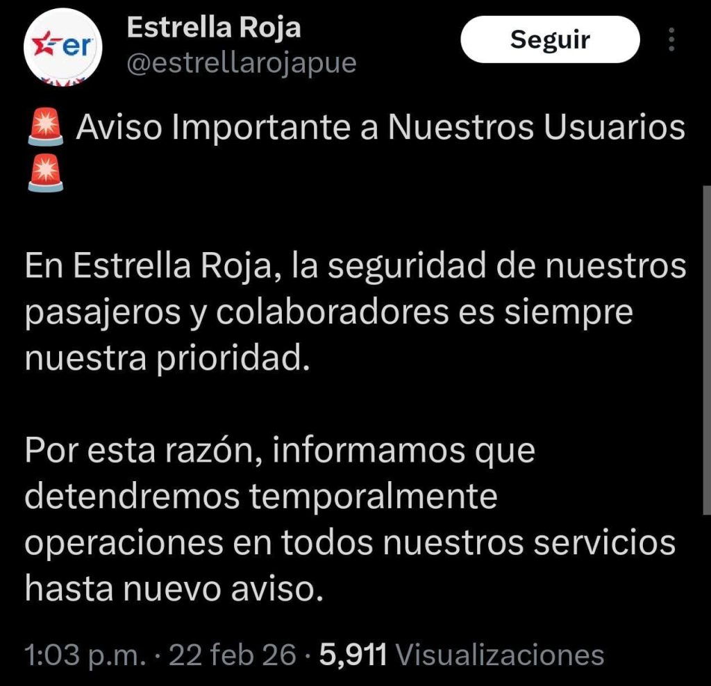 En una decisión histórica que refleja la gravedad de la situación, la empresa Estrella Roja y el grupo ADO anunciaron la suspensión temporal de todos sus servicios «hasta nuevo aviso». La firma argumentó que no existen condiciones de seguridad para pasajeros ni colaboradores, dejando a cientos de usuarios varados en la terminal de la 4 Poniente y la CAPU.