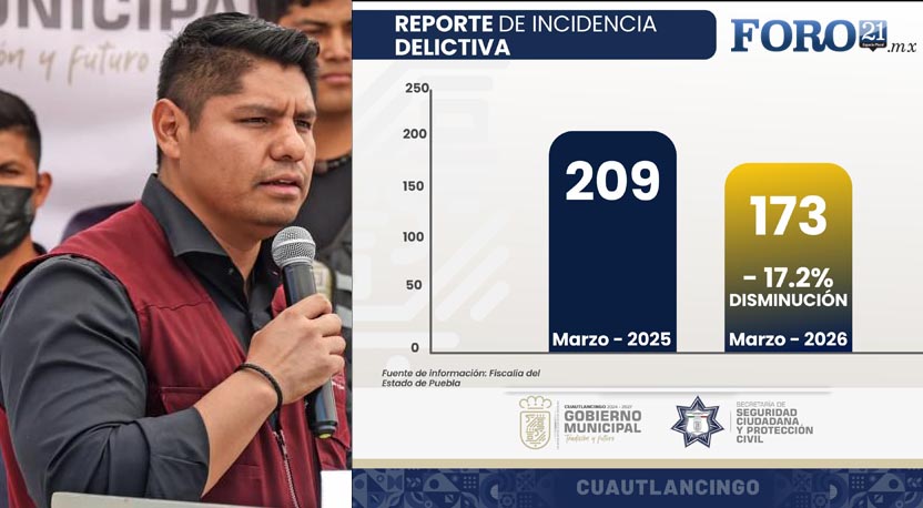 CUAUTLANCINGO, Pue. — Las cifras oficiales de la Fiscalía General del Estado (FGE) confirman lo que se percibe en las calles: Cuautlancingo está logrando una reducción sostenida en su índice delictivo. Al cierre de marzo de 2026, el municipio registró una disminución del 17.2%, sumando así tres meses de tendencia a la baja desde el inicio de la actual estrategia de seguridad encabezada por el alcalde Omar Muñoz.